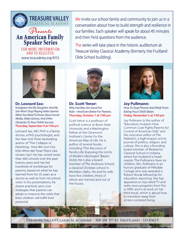 Scott Yenor is a professor of political science at Boise State University and a Washington Fellow at the Claremont Institute’s Center for the American Way of Life.  He is author of several books, including “The Recovery of Family Life: Exposing the Limits of Modern Ideologies” (Baylor 2020).  He is also a board member of The Ambrose School, a classical Christian school in Meridian, Idaho.  He and his wife have five children, three of whom are married and out of the house.
